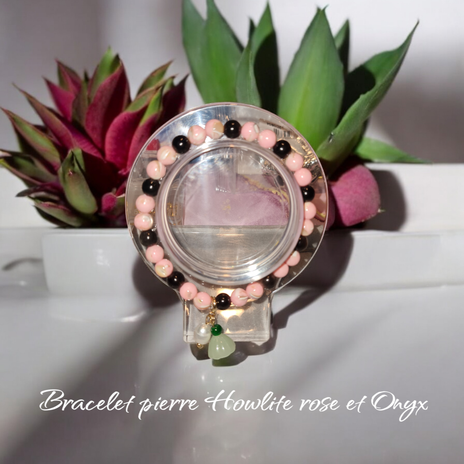 Bracelet 67 pierre naturelle Quartz rose et Onyx doré