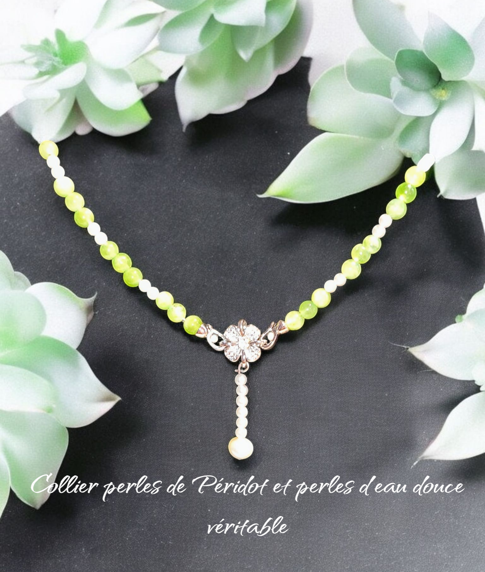 Magnifique pierres de Péridot qualité AAA et perles d'eau douce véritable fermoire sur le devant orné d'une fleurs et de strass