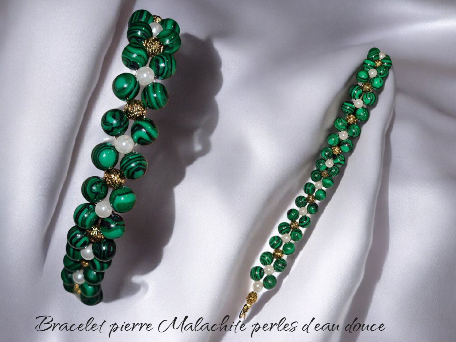 Bracelet 144 pierre naturelle Malachite et perles d'eau douce véritable