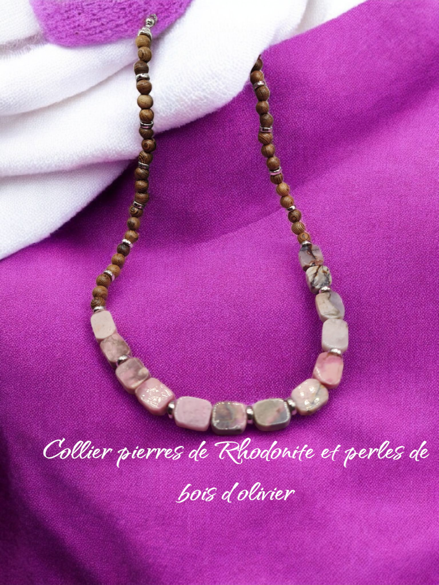Pierres véritables Rhodonite et perles de bois d'olivier