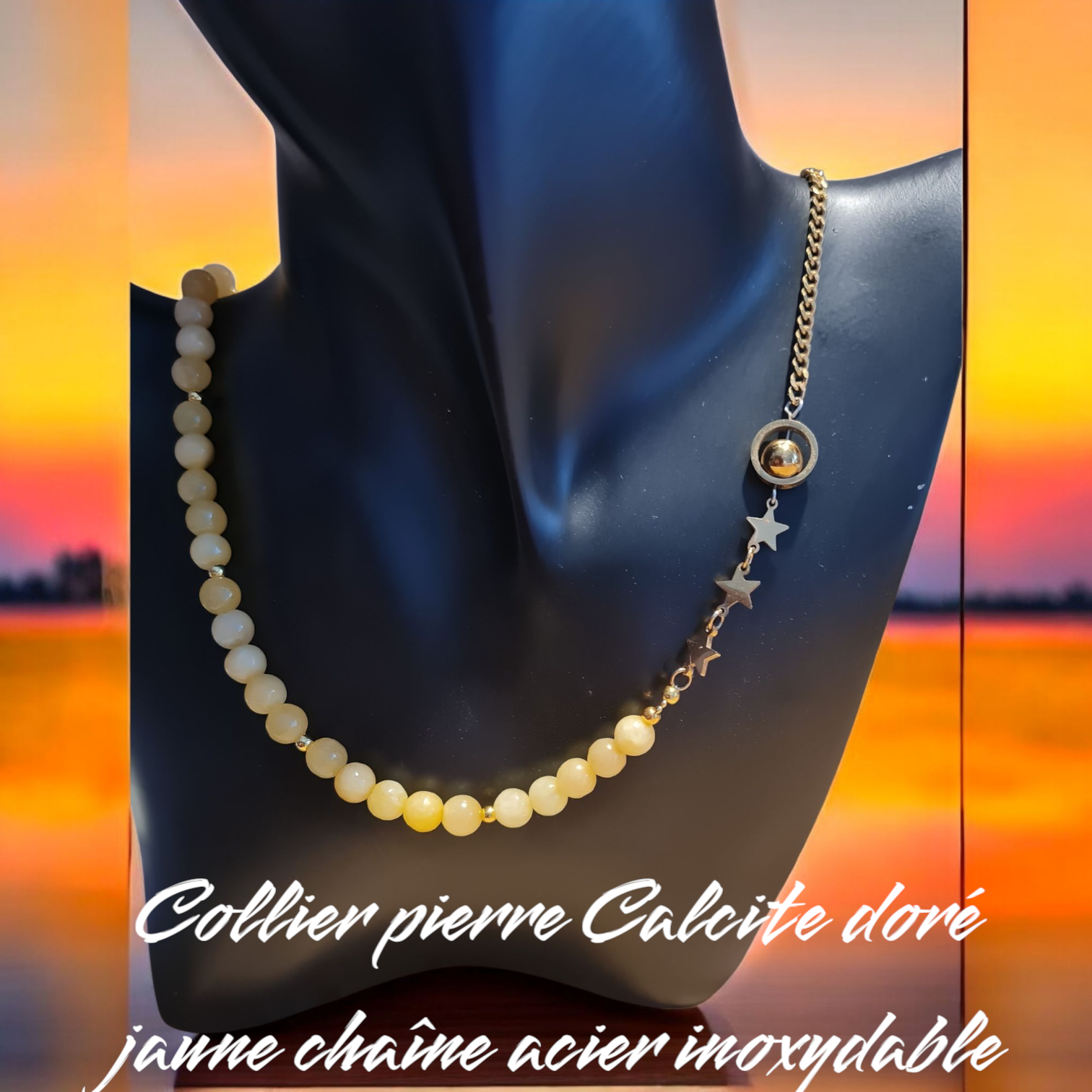 Pierre naturelle Calcite doré jaune 6mm chaîne et déco acier inoxydable